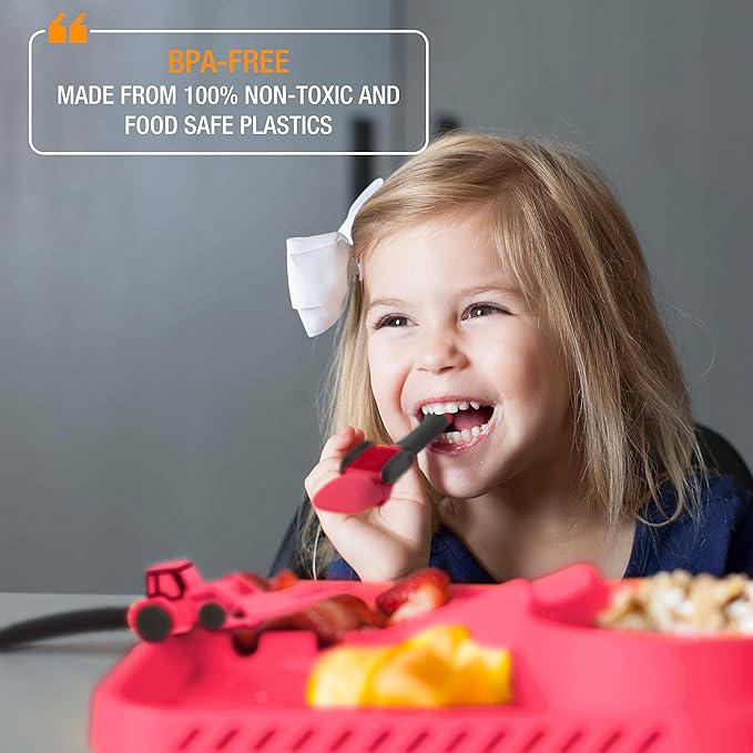 - CONSTRUCTION THEMED UTENSILS: Dinneractive construction themed toddler eating utensils set include 1x “Tractor” Fork and 1x “Loader” Spoon – interactive theme and bright colors engages kids with their food in a creative way