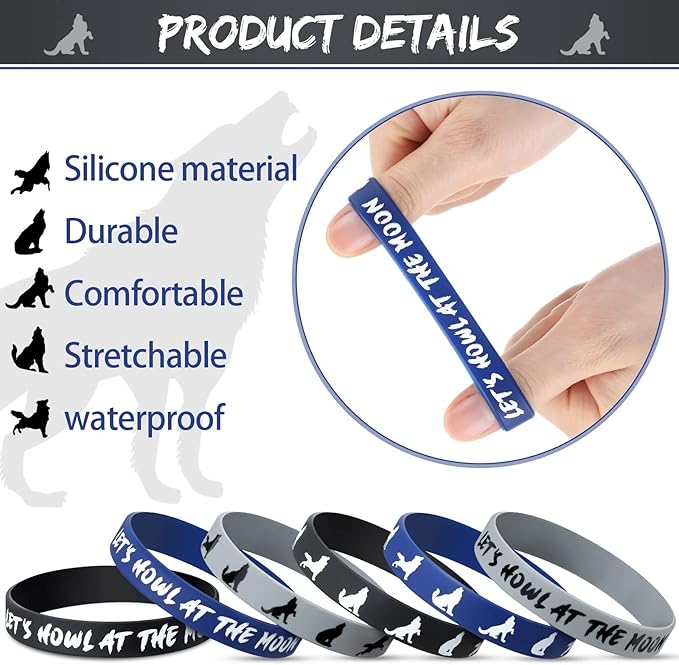 - Sufficient quantity: The package contains 30 pieces wolf party silicone bracelets in 3 different colors of blue, black and gray , 10 pieces in each color, sufficient quantity to meet your children's daily use and replacement needs; The stylish and delicate appearance can make your birthday party more funny and full of surprises