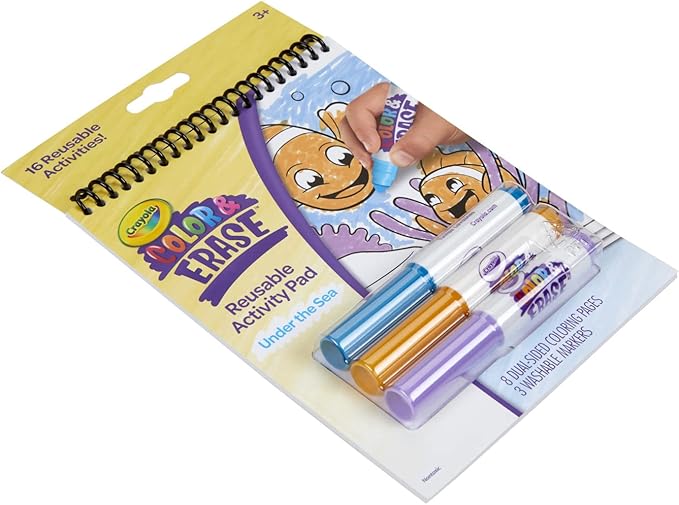 - CRAYOLA COLOR & ERASE REUSABLE ACTIVITY PAD — UNDER THE SEA: Includes 8 Dual-Sided, Reusable, 5” x 7” Activity Pages and 3 Washable Markers.