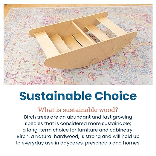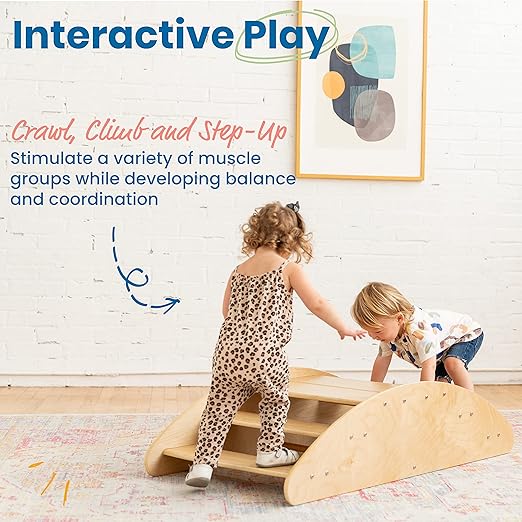 - Two-Sided Play: Engage in active play on the teeter-totter with a center dowel for little hands to hold providing additional security; turn it over to practice motor skills on the six sturdy stairs