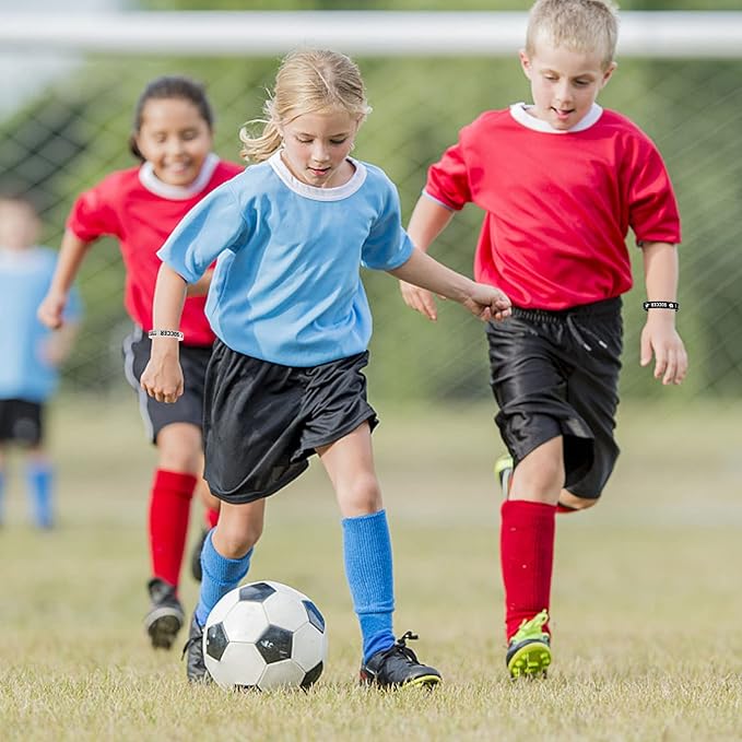 - One size fits most: these soccer themed rubber wristbands are in the same size, each measures 2.56 inches in diameter, 0.47 inches in width, they can be stretched to fit different hands, one size fits most boys and girls OVER 12 years old.