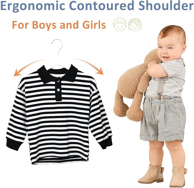 - Contoured Shoulders and Hand-polished Notches: Baby hangers for closet is designed according to toddler shoulder shape will keep child's clothes in shape without bumps. The precisely-cut shoulder notches maintain tank tops in the place and well hand-polished notches without burrs for protecting your clothes.