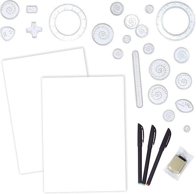 - DELUXE ART SET: This all inclusive art set comes with everything you need to create tons of beautiful spiral designs! With 22 different style spirals, 20 sheets of paper, 3 pens, putty, and an instruction sheet; this kit is perfect for practicing your spiral art and creating stunning images with your friends! Comes with the tools for you and your BFFs to design at the same time!