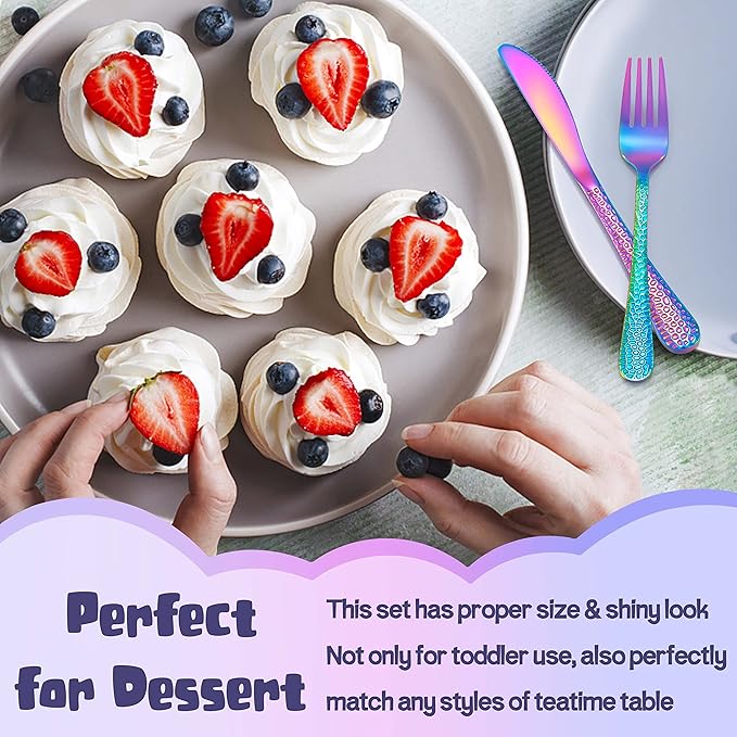 - 【EXQUISITE WORKMANSHIP】Customized mini size to fit toddler’s hands and mouth, All of utensils have smooth edge for toddler’s safe, The tines of fork are proper thin, which make easy for kids poke food by themselves, Blunt and round blade are serrated but safe in use, Suitable for toddlers to practice and adapt to real silverware, Suggest for 24 months +