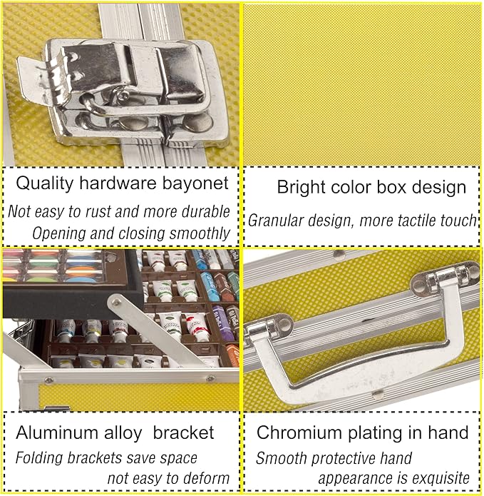 - Gift Box: Comes in a deluxe aluminum suitcase with two layers and lots of colorful art supplies to inspire creativity.