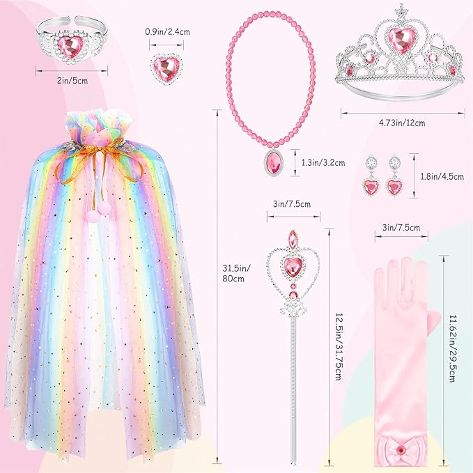 - Princess Dress Up Set: Come with princess cape, princess crown tiara, princess magic wand, princess gloves, bracelet, ring, necklace, clip-on earrings. Rich dress up accessories for your little girls.