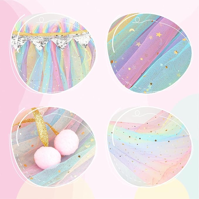 - Stylish and Sequins Cloak: Princess cape is made of soft and high quality mesh fabric, the neck of cloak with soft gold strap to prevent the shawl from falling off. Long and lightweight princess cape dotted with stars and moons that little girls love, very dazzling, makes your little girls stand out of crowd.
