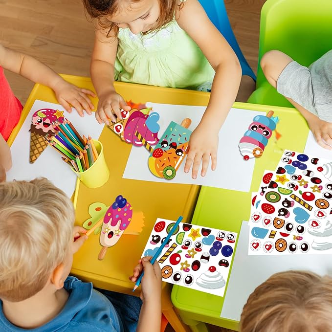 - 【Popular Craft for Kids】Try some fresh summer games with your kids! Just encourage kids to make there own sweets,with these simple and fun card and sticker game.These summer craft kits can help to create a funny holiday atmosphere and joy.