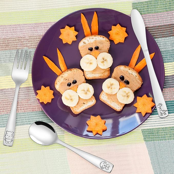 - PREMIUM 18/0 STAINLESS STEEL: All the cutlery crafted from 100% high-quality 18/0 stainless steel, that is totally food safe for children, and non-toxic. As premium stainless steel, they will not rust or corrode, which will not produce any harmful substances for children, and parents can rest assured to buy it for your kids. Meanwhile, they are dishwasher safe, so you can directly put them in it to wash with your daily silverware.