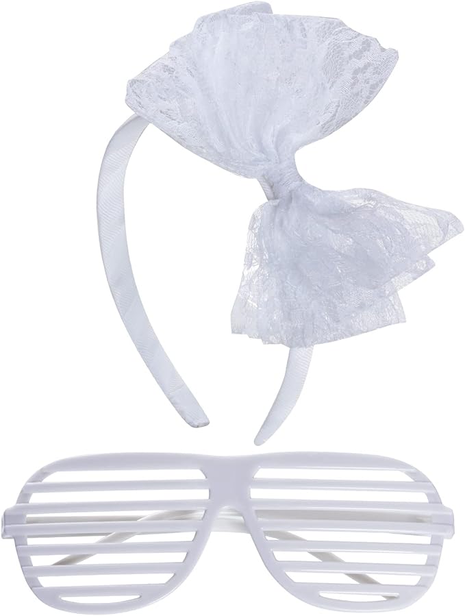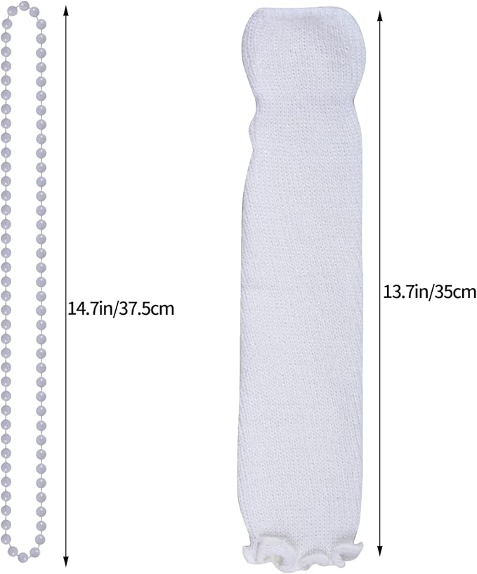 - Package Content: 1 pc white net yarn skirt(waist wide: 6.8"/17.5cm, which can be stretched to17"/43cm), 1 pair long gloves(10.2"/26cm), 1 pair of white leggings socks(13.7"/35cm), 4 pcs solid color necklace(14.7"/35cm), a pair of shutters glasses and 1 pc lace headband bow.