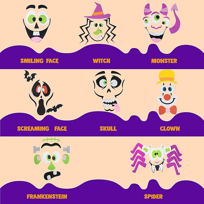 - Cute Designs: 3D pumpkin stickers designs make your pumpkin more attractive and more fun. such as Witch, Vampire, Bat, Cat, Frankenstein, Skull, Mummy, Spider etc, dinosaur and other spooky faces, the best foam stickers to decorate your pumpkin face for Halloween party, haunted house and jack-o-lantern.