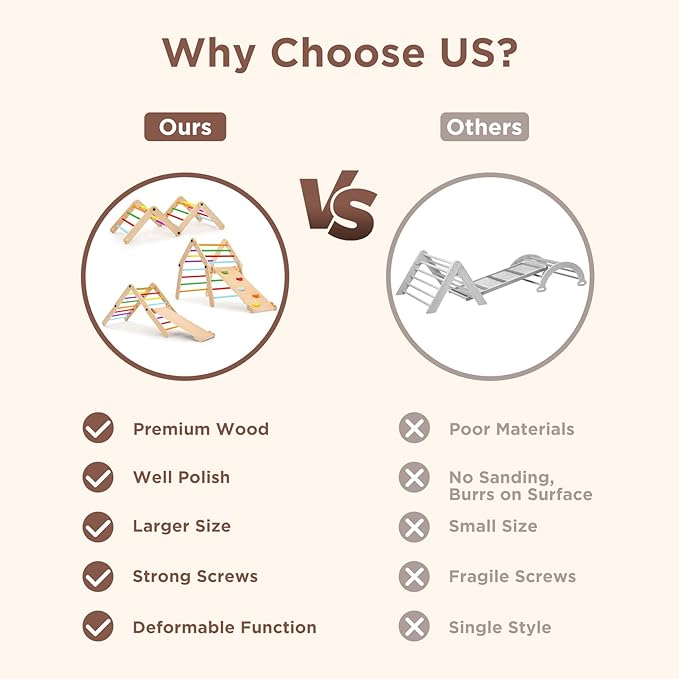 - 【FSC-certified Safe Materials, CPSC Approved Structure】Dripex pickler climbing set is crafted from 100% traceable, natural, non-toxic wood and sanded to a smooth, edge-free finish after hundreds of polish. With our toddler climbing toys indoor, you can rest easy knowing your child is playing with a high-quality materials pikler triangle set, free from concerns about unknown sources or poor-quality wood. Furthermore, it has been approved by the US CPSC, which is a power proof of products' safety