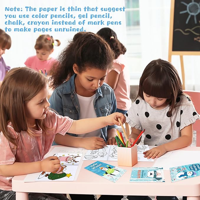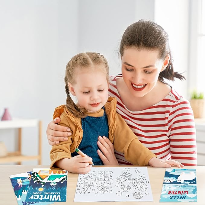 - [Wide applications] Our winter coloring books kit is a great choice to spend time in festival with kids. It’s also an ideal as a gift for kids birthday gift, holiday gift, winter outside, Christmas, new year theme party supplies. This product also suitable as an art class painting works if you are an art teacher in school, making the class atmosphere more interesting and happy.