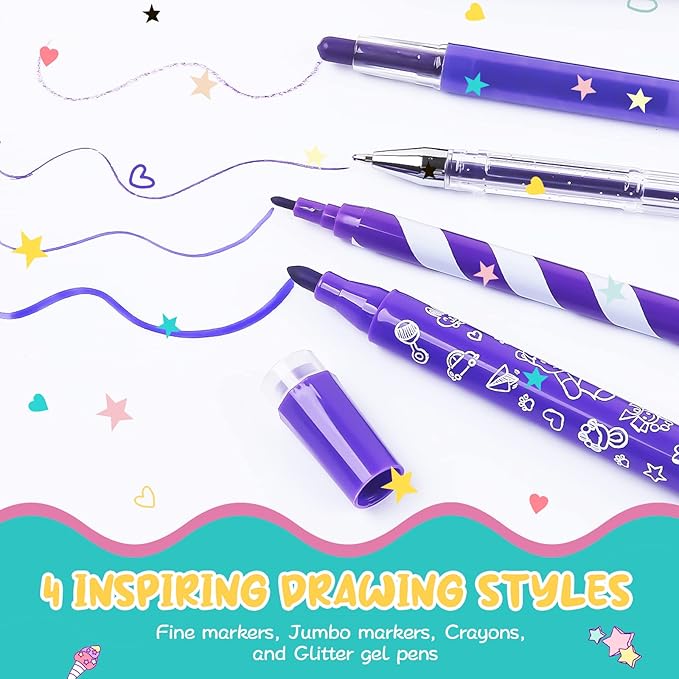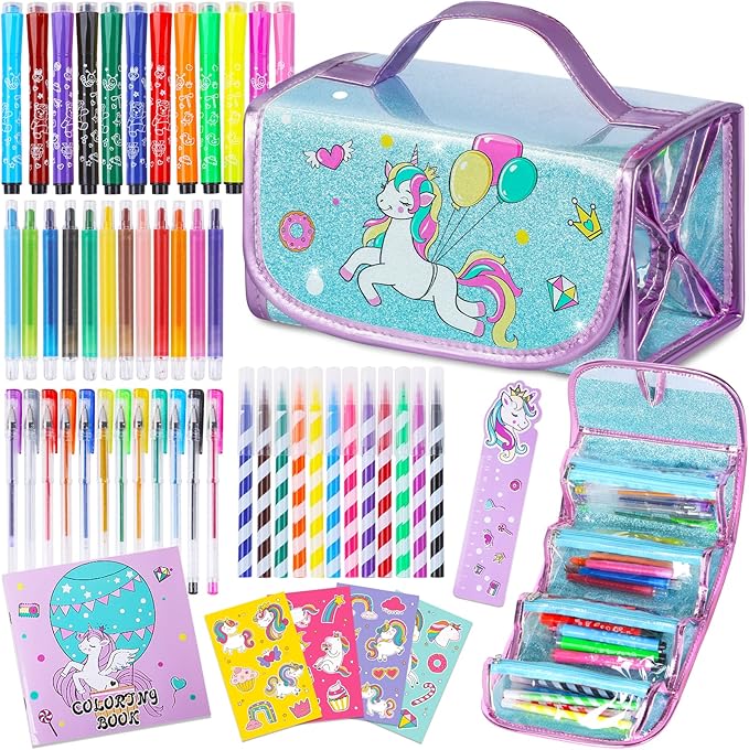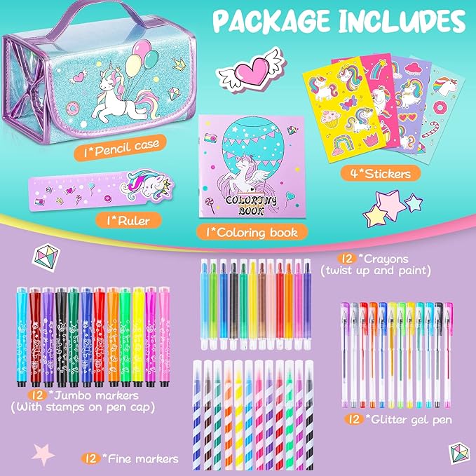 - Amazing Unicorn Markers Set: Our unicorn art set with pencil case includes 12 jumbo markers, 12 fine markers, 12 twist-able crayons, 12 glitter gel pens, 1 unicorn coloring book, 4 unicorn stickers and 1 unicorn ruler. Assortment craft supplies for girls age 5-8 can make thick or thin lines for a variety of coloring writing, drawing or doodling techniques.