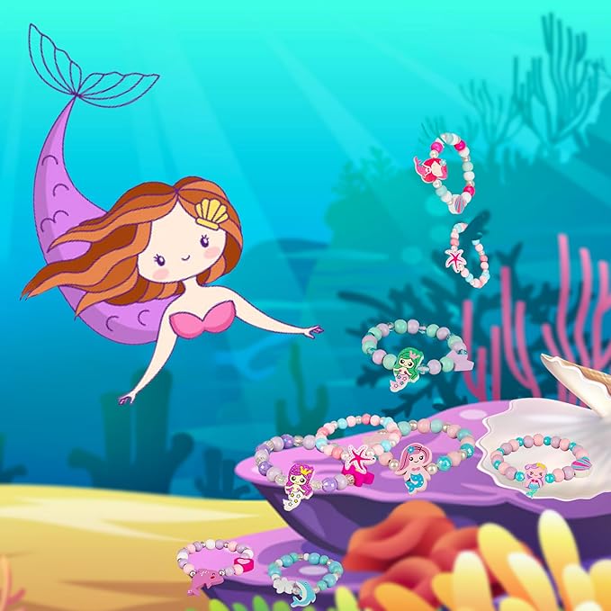 - CUTE ORIGINAL DESIGN STYLES: 12 different styles pastel rainbow beaded bracelets set included with the girls loved mermaids, sea-star, seashell, dolphin various adorable charms all in one package. It will be perfect gift choice for 3-8 years old girls mermaid lovers or birthday party favors ideal.