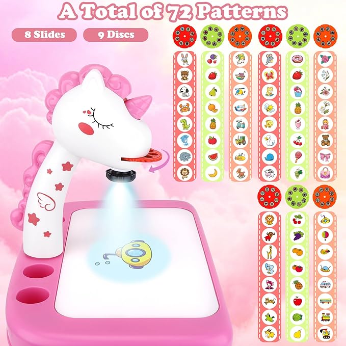- Package Contents - This extensive arts and crafts set for kids comes with a drawing projector table and a plethora of supplles to spark their imagina tion and nurture their artistic talents. The set includes 12 color drawing pens, 12 colored drawing pencils, 12 colored crayons, 1 drawing book, 1 unicorn sticker book,9 projection discs, and a board eraser.