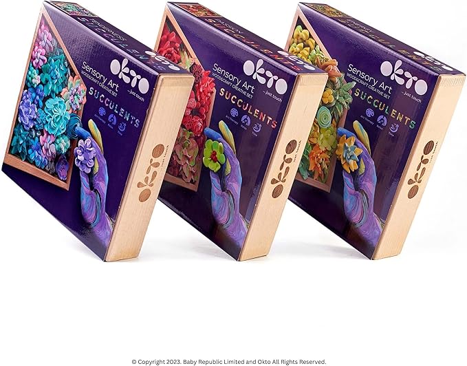 - Find time for relaxation with Okto Art Kit: Immerse yourself in the sculpting process and be inspired by the gentle serenity of pink, the mystery of purple, the turquoise color of sea waves, cool blue - the color of the sky, space, air and freedom, the balance and purity of white. The pastel colors of modeling clays in our succulent craft box suggest naive fantasies and dreams. Okto craft set Tenderness immerses in thinking and promotes a creative atmosphere.