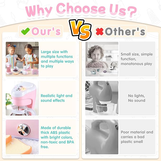 - High-fidelity play kitchen accessories for kids:cocinas de niñas including a pretend toy coffee maker for kids, a toy mixer, and a toy toaster, which can be used to accompany children to spend a happy parent-child time, guide children to make afternoon tea by themselves, and your children can make Coffee and make delicious cookies with you. improve children's hands-on ability, and cultivate children's interest.