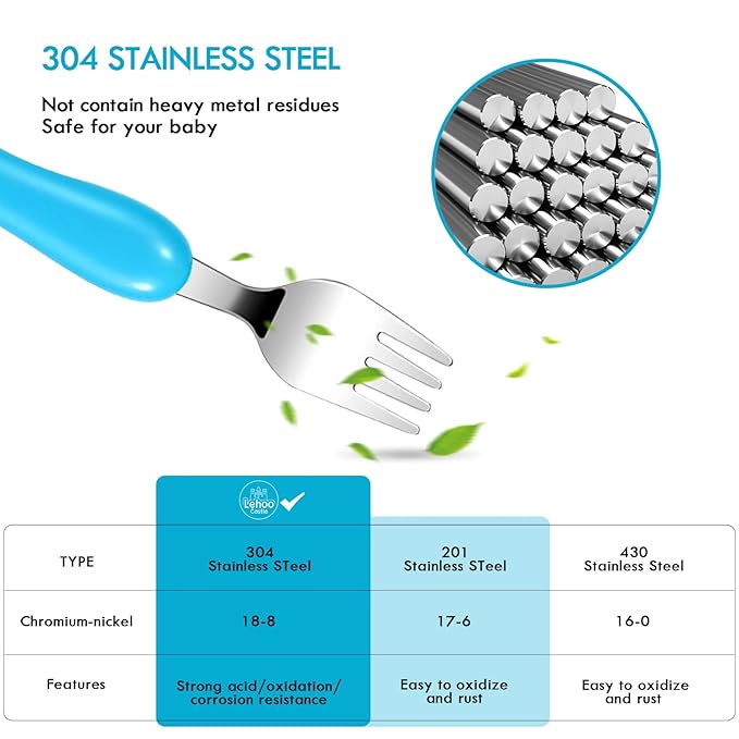 - SAFE TODDLER UTENSILS SET: Made of durable food grade stainless steel, all non-corrosive, BPA-free and easy to clean (NOT dishwasher safe to avoid color loss)