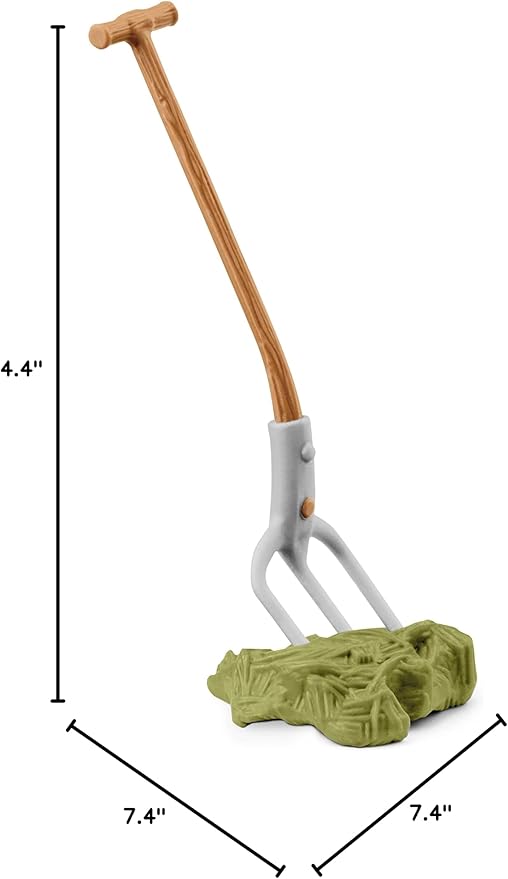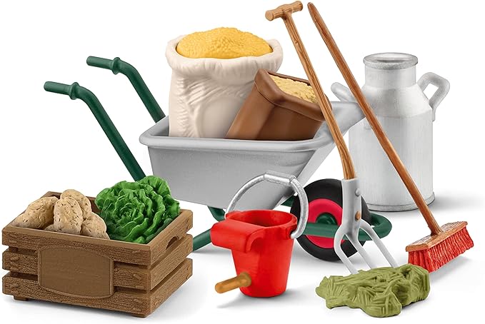 - FARM TOY ACCESSORIES. This set includes 1x wheelbarrow, 1x bag of oats, 1x bag of treats, 1x haybale, 1x pitchfork, 1x broom, 1x potato, 1x lettuce, 1x milk can, 1x feed box, 1x bucket for calf