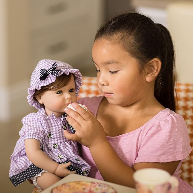- 5-PIECE DOLL SET - This Adora Bees Knees baby doll set includes one 20" weighted baby doll, a handmade lavender gingham seersucker dress with embroidered bees, a matching hat with bow, daisy sandals, and white bloomers