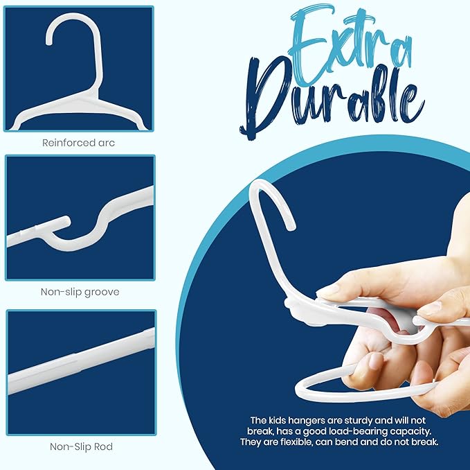 - Kids Clothes Hanger – The pack contains non-slip and crease-resistant children hangers with each measuring, 11.5 x 6.25 x 0.21 (inches) dimensions. Ideal for hanging kids, toddlers and infants clothing