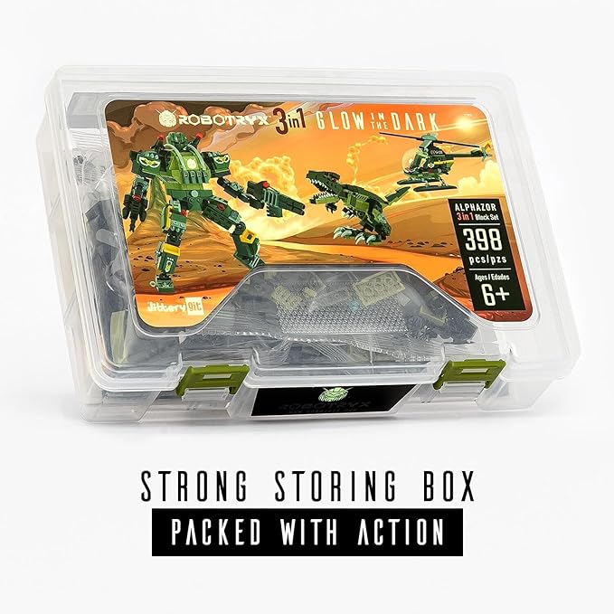 - 【Lots of Pieces for Hours of Fun!】This toy robot building construction kit with 398 interlocking brick and block pieces provides limitless fun. Kids can build three different figure forms including a Robot, a Raptor Dinosaur, and an Attack Chopper. Kids can be creative with buildable connector pieces to build robot characters. Glowing stickers let kids customize for DIY fun. They make their own stories with mech action figure and army action figures that are great presents for 8 year old boys.