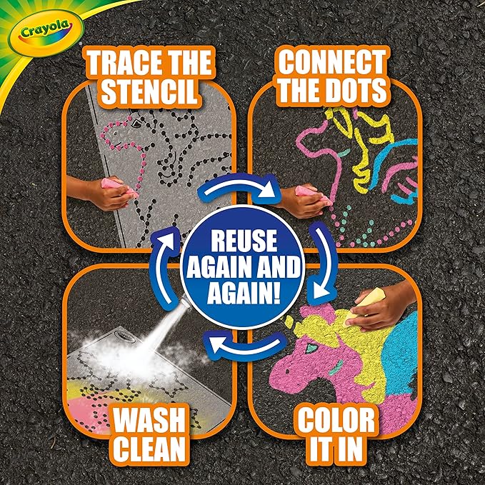 - EASY TO USE: Each stencil is transparent and perforated so kids can trace a perfect dotted outline on a blacktop or sidewalk and color it in!