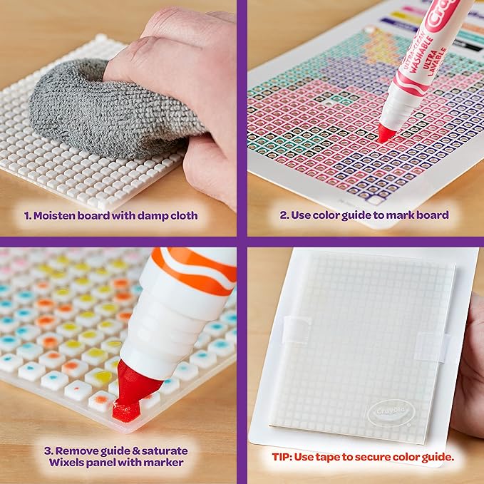 - CRAYOLA WIXELS UNICORN ACTIVITY: This pixel art coloring set includes 2 Wixel Panels, 2 Color Maps, and 8 Washable Markers.
