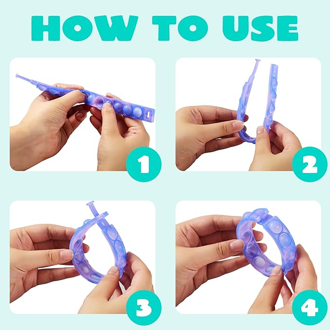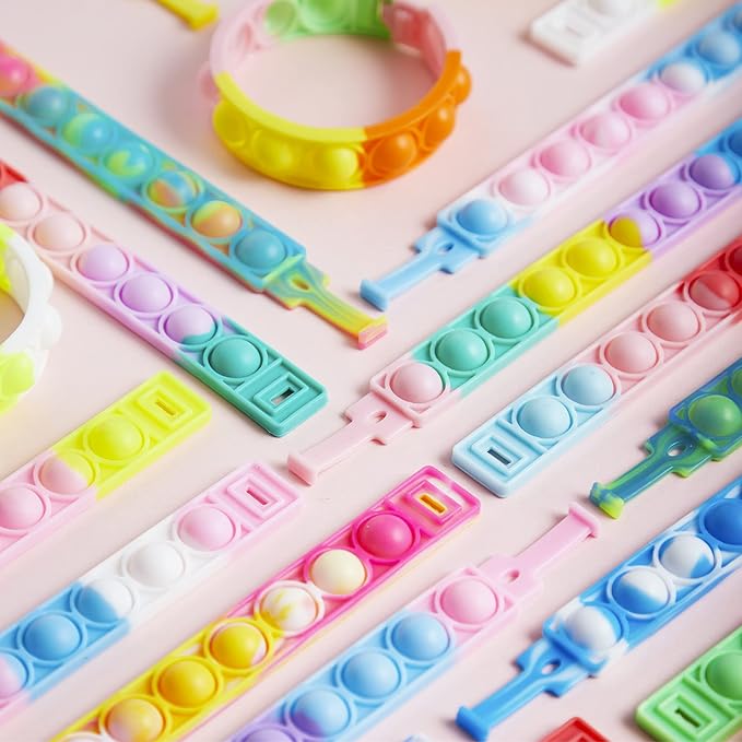 - UNIQUE DESIGN. Our fidget bracelets toys are made of high quality silicone material with a smooth surface. The pop bracelets are flexible and can be adjusted in length according to the actual condition of the wrist, which is suitable for kids and adults to wear and play. The finger press design of the bracelet is designed to relieve stress and encourage tactile stimulation, calming and focusing effects and helps children and adults immerse themselves in the pleasures of decompression.