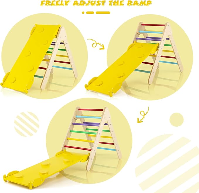 - 【3 in 1 Triangle Climber】This kids climbing toy set includes a climber with a stable triangular structure and a reversible ramp. Children can play the climber separately. Besides, the climber can be connected to the ramp with the sliding side on or the climbing side on.