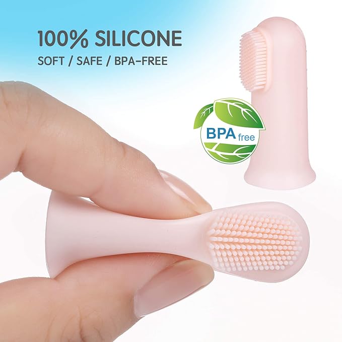 - MULTI-FUNCTIONAL- The kids fingertip toothbrush has a double-sided design. One side has the soft bristles feature while the other side has delicate massage bumps. You can use toddler's finger toothbrush to clean their teeth, and use the back clean their tongue. The Oral Massager can massage baby's gums, help them relieve teething discomfort