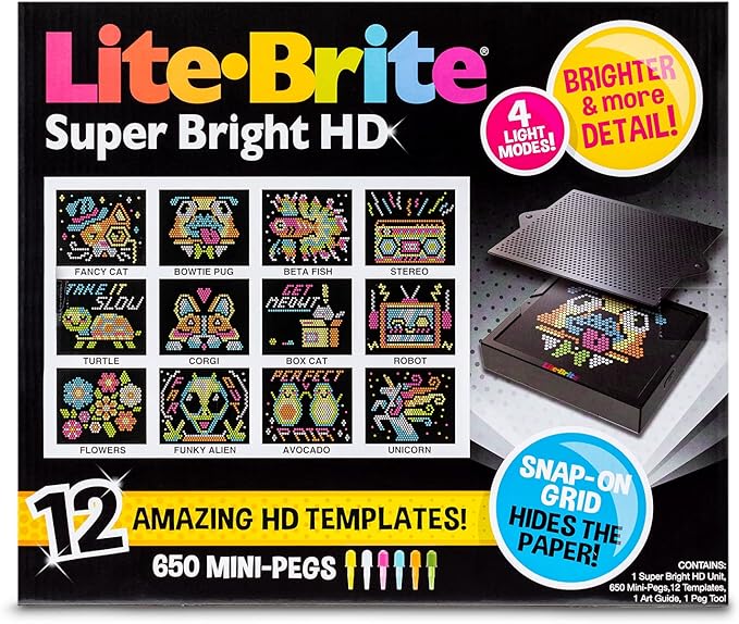 - Snap-On Grid: The Lite-Brite Super Bright HD was designed with a new SNAP-ON grid that lets you place the templates underneath, allowing your art to really shine!