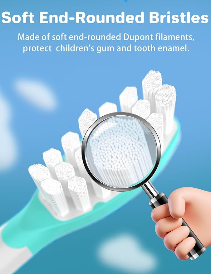 - SOFT END-ROUNDED BRISTLE: These bristles fit the contour of child's teeth and are made of end-rounded premium Dupont Tynex Nylon. The bristles provide both a great cleaning experience and help protect children’s sensitive gums and tooth enamel.