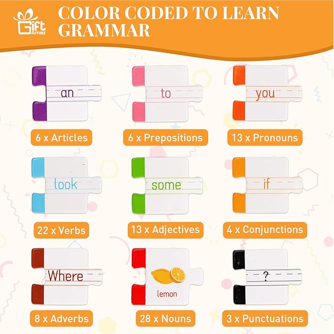 - Safe & Durable Material: The sentence building words puzzles are made of eco-friendly paper, non-toxic and safe. And the wooden alphabets are made of natural wood and water-based paint, kids can play at ease. Each puzzle card is color-coded into groups of adjectives, nouns, verbs, conjunctions, pronouns, prepositions, articles, and punctuation, which is a great visual way for kids to learn grammar and build early learning & writing skills