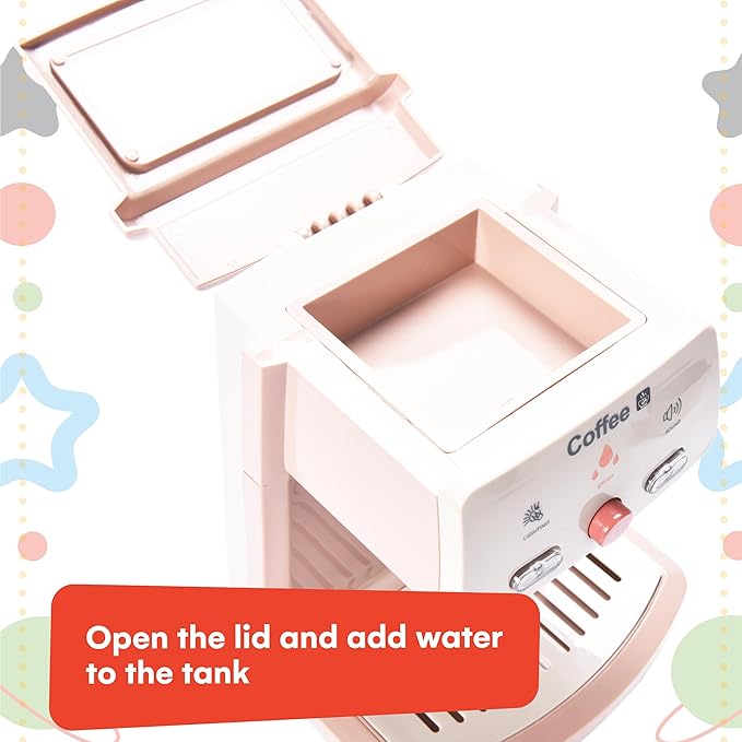 - Easy to Use and Learn: Designed for simplicity, kids can open the lid and add water to the tank, mimicking a real coffee maker; it offers a hands-on learning experience