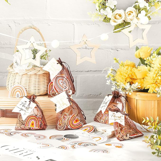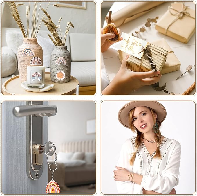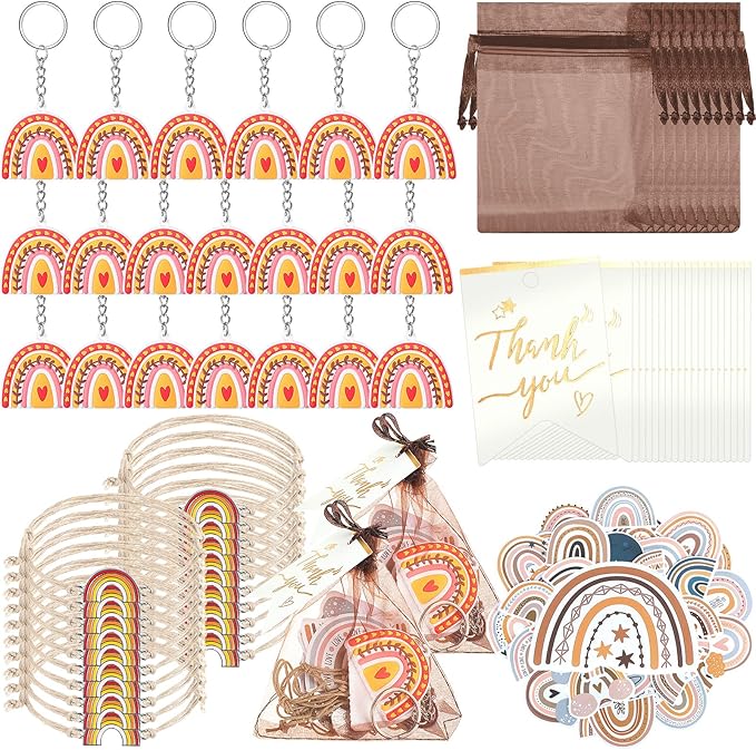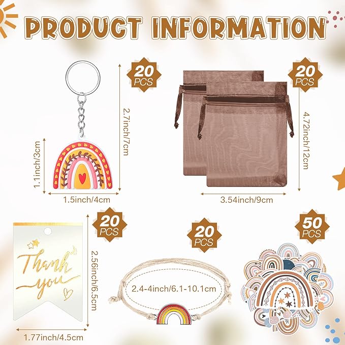 - Boho Party Gift Set: you will receive 20 pieces of rainbow keychains, 20 pieces of Bohemia bracelets, 20 pieces of thank you kraft tags, 50 pieces of rainbow stickers, 20 pieces of organza bags, abundant in quantity, meeting your different decorative needs, enough to share with your friends
