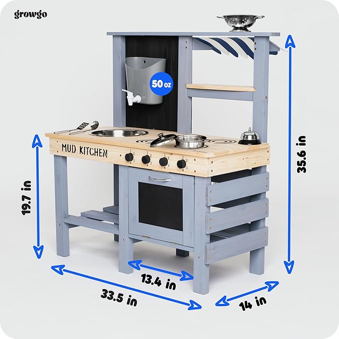 - 2 IN 1 - This double-sided stand acts as a wooden kitchen/toy grocery store! Montessori-inspired, durable & sturdy, this outdoor kitchen has a water-based, waterproof coating. Kids age 3+ can safely play house, learning useful everyday skills.