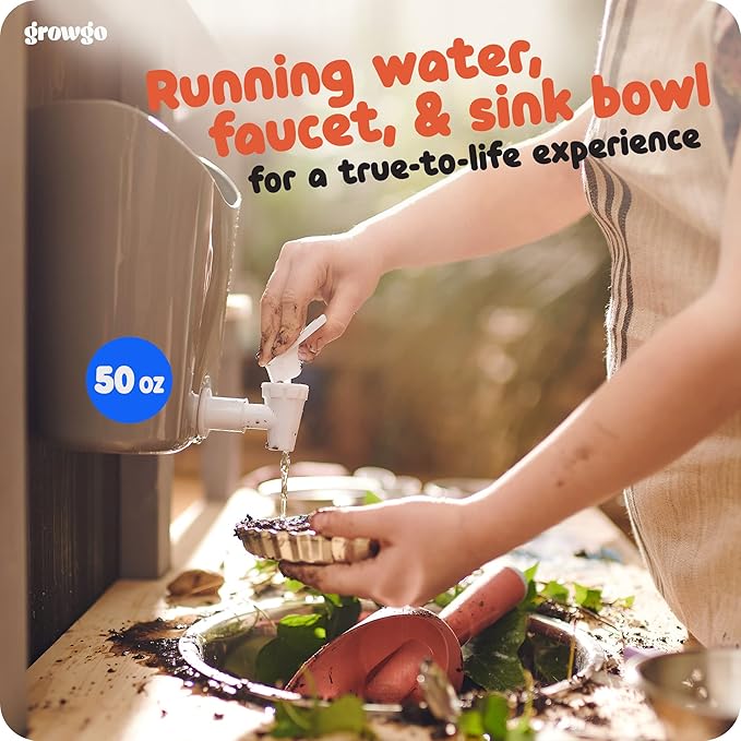- WATER TAP - This toddler sink toy with running water lets kids easily mix mud batter & wash dishes! The stainless-steel sink is removable, while the 50 oz water tank has a functional faucet. With running water, kids will spend hours playing outside!