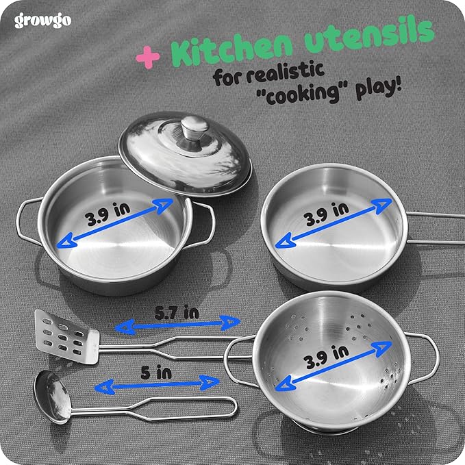 - ADDED UTENSILS - This outdoor play market stand for kids comes with stainless-steel mud kitchen accessories. With a polished finish, these 6 pieces of play kitchen accessories look like real kitchenware!