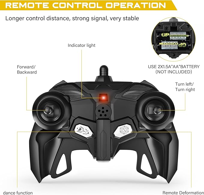 - Great for Kids into Transformers - The design of the car and color is very stylish and dazzling, the range of remote coverage is also very long. The toy is fun to play with in either mode: car or robot. 2 in 1 toy is interesting and educational, helpful for developing kid's intelligence and practicing ability, promoting hand-eye coordination.