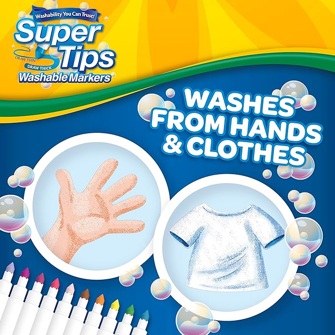 - WASHABLE MARKERS: Explore creativity without permanent stains. Crayola washable markers wash easily from skin and most clothing!