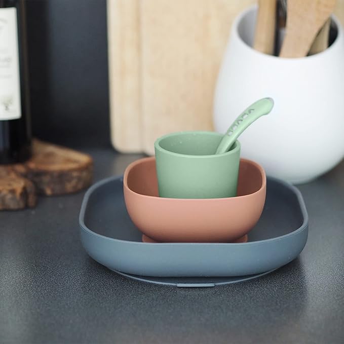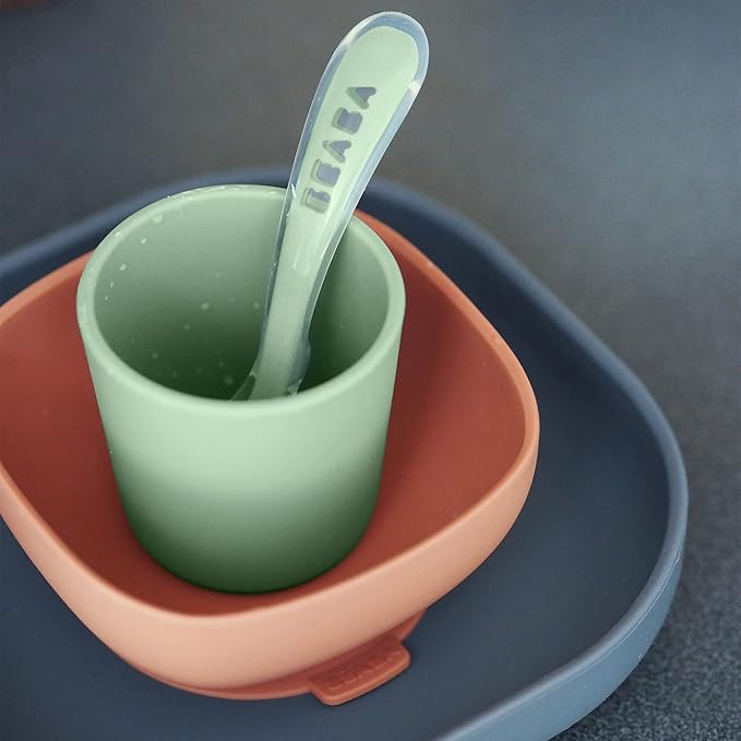 BEABA 100% Silicone 4 Piece Baby Feeding Set, Suction Plates for Baby, Includes Plate, Bowl, Cup, 2nd Stage Silicone Spoon, High Grade Food Safe Silicone, Mineral