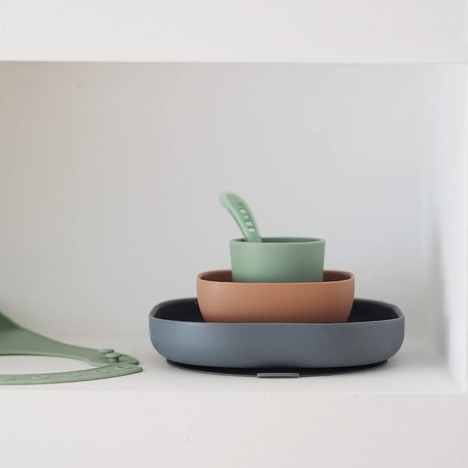 BEABA 100% Silicone 4 Piece Baby Feeding Set, Suction Plates for Baby, Includes Plate, Bowl, Cup, 2nd Stage Silicone Spoon, High Grade Food Safe Silicone, Mineral