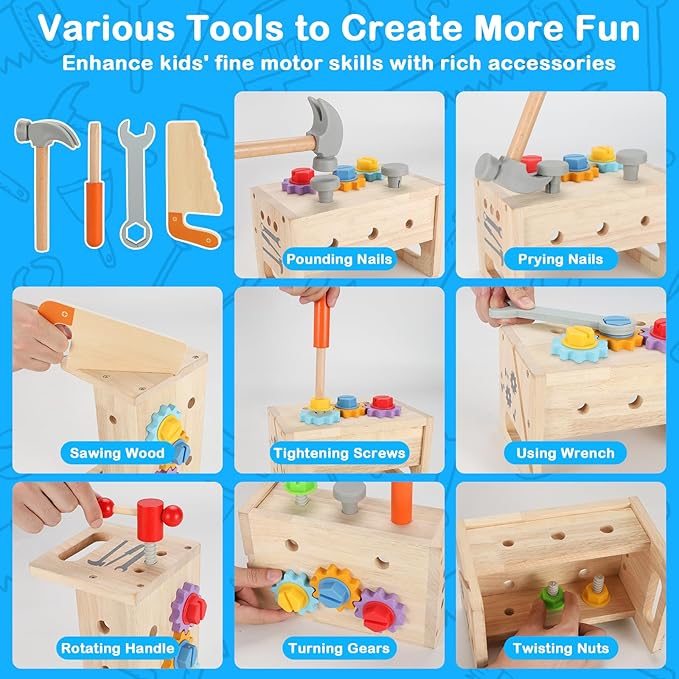 - 【29pcs Value Montessori Wooden Kids Tool Set】 Our toddler tool set includes wooden kids tool bench / box×1, saw×1, hammer×1, screwdriver×1, wrench×1, nut×5, gear×3, screw×5, nail×2, assembly piece×6, building block×1, rotated handle×1 and handle×1. Brightly colored and diverse wooden kids tools will make your children fully experience the fun of playing with STEM construction tool toys.