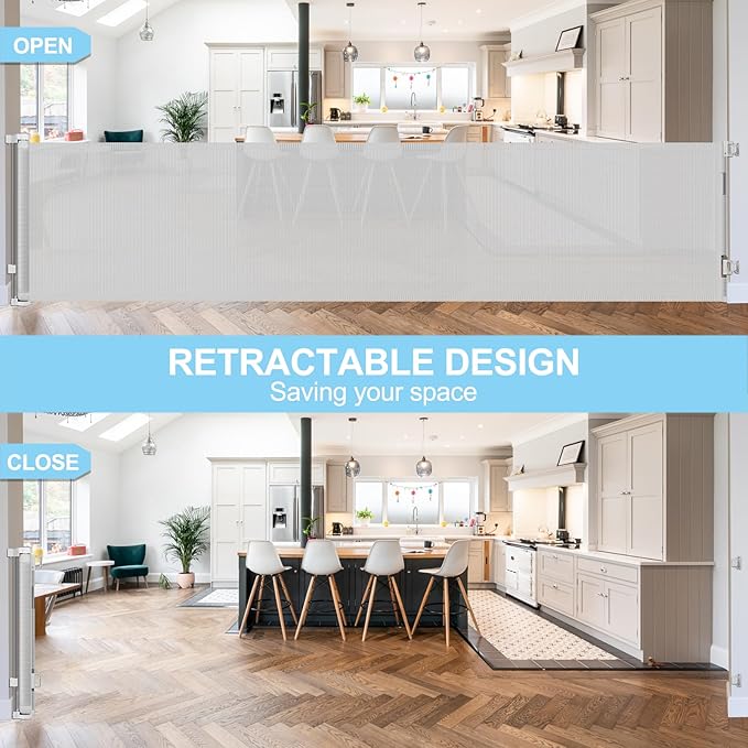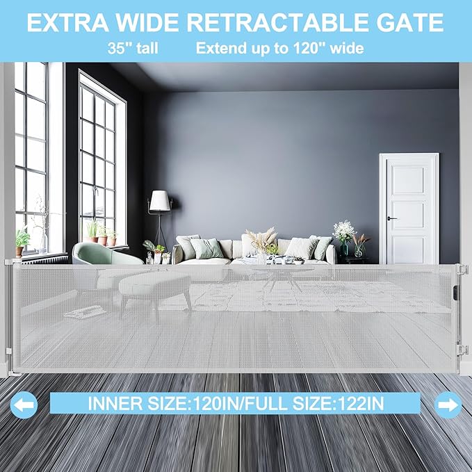- [120" Extra Wide & Retractable Design]Extra wide retractable baby gates can be extended up to 120 inches wide and 35 inches tall. (inner size:120" wide,full size:122" wide). Mesh can be completely retracted away when not in use.