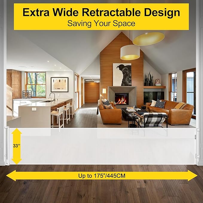 - [175" Extra Wide & Retractable Design] Our retractable dog gates extra wide can be extended up to 175 inches wide and 33 inches tall. When not in use, the mesh can be completely retracted away to save space. Please measure before installation to ensure the size fits your opening.