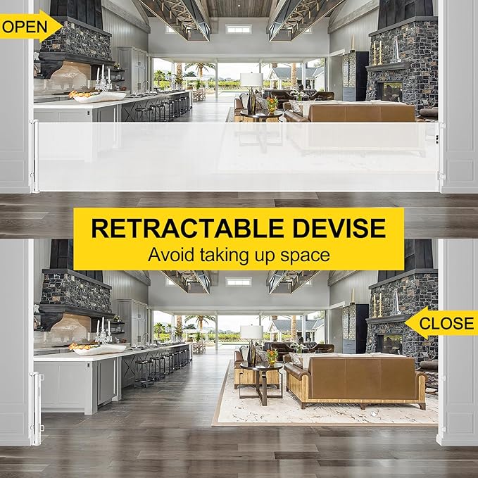 - [Baby Play Area] You can use the extra wide retractable baby gate to separate a safe play area for your baby in your home. Keep your dog out of the baby safety gate and do not disturb your baby.