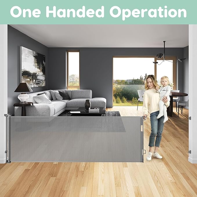 - Indoor / Outdoor Gate : extra long retractable baby gate can be used indoors and outdoors, such as in bottom of stairs, doorways, hallways, fireplaces, front doors, porches, garage doors, decks, patios.