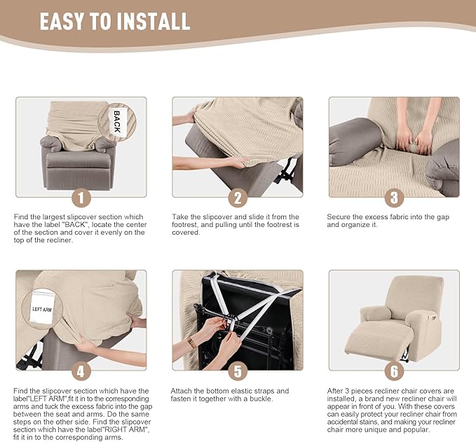 - EASY TO INSTALL: Our recliner sofa slipcovers have exquisite workmanship, including 2 pieces arm covers, 1 piece seat cover, 3 pieces cover totally. The recliner covers also equips with bottom elastic and reinforcement straps, you can use buckle to make the cover in place without moving